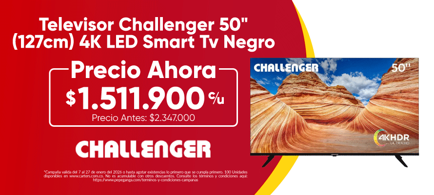 Click me36%ChallengerTelevisor Challenger 50" (127cm) 4K LED Smart Tv Negro UHD50KG85BTGOOGLETVT2 $1.511.900$2.347.000Agregar al carrito